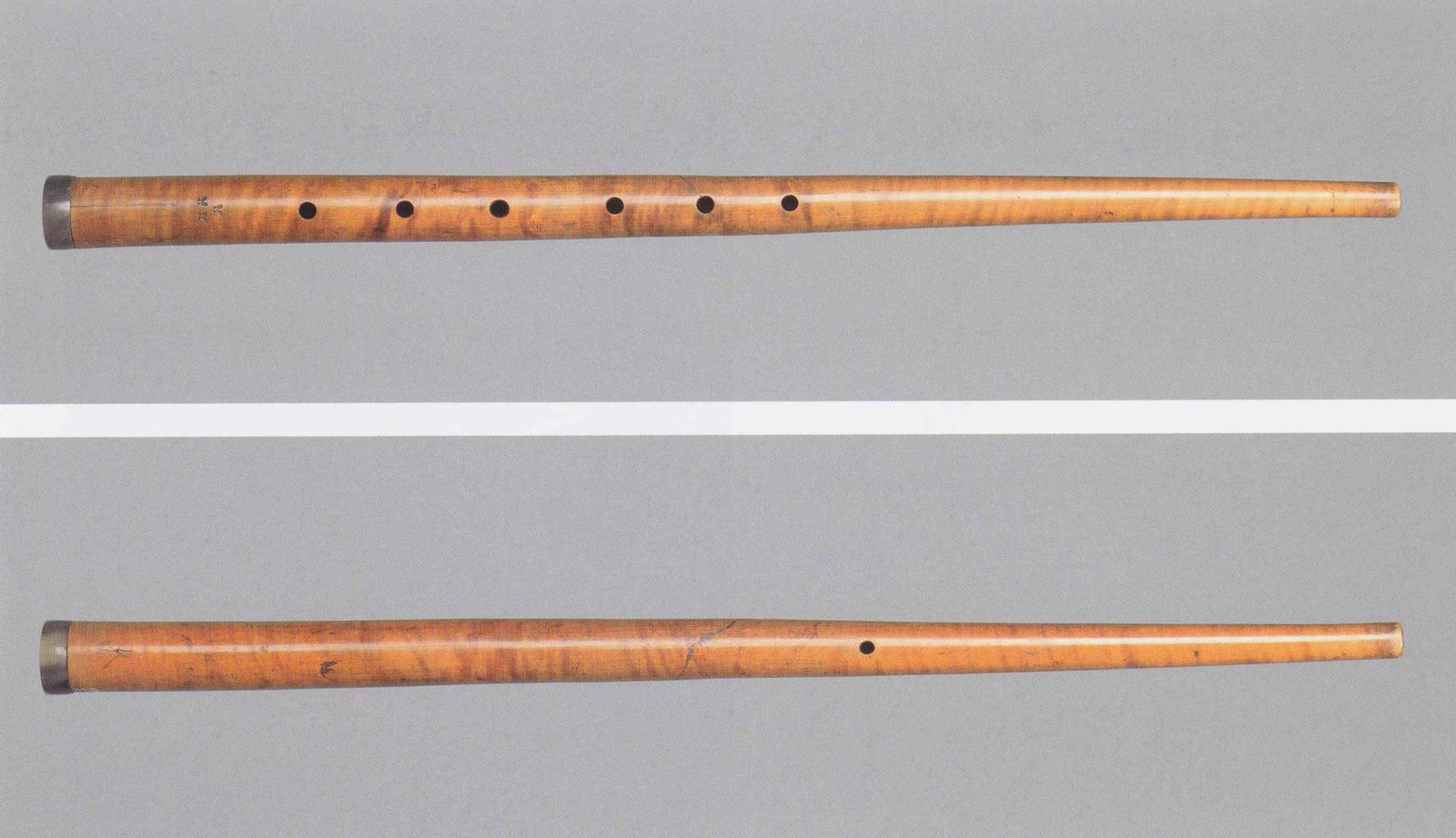 These instruments are tuned in F (with A around 470 Hz. for most players) and they have a V-shaped carved-in embouchure which produces the characteristic „mute“ sound we are used to expect nowadays from this instrument.