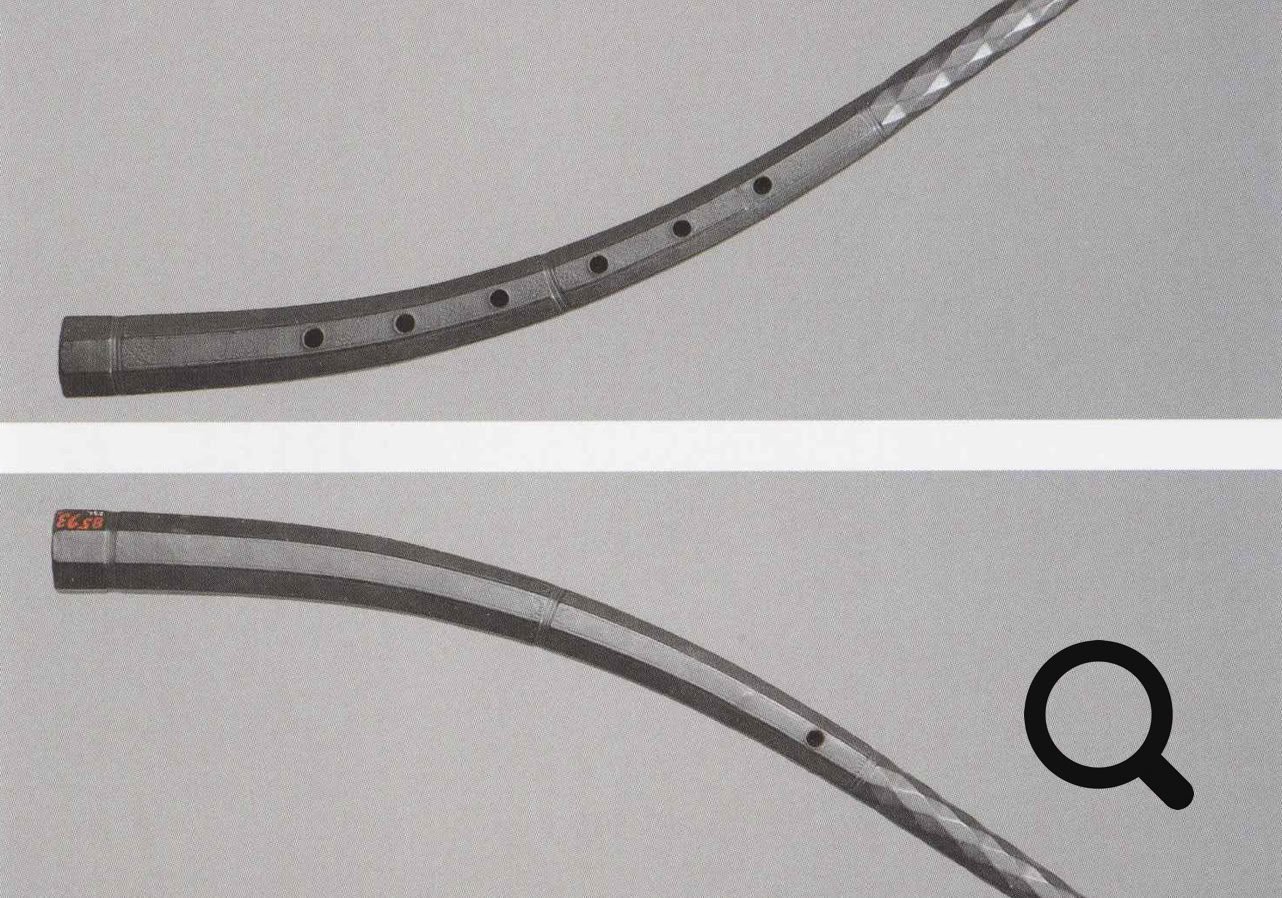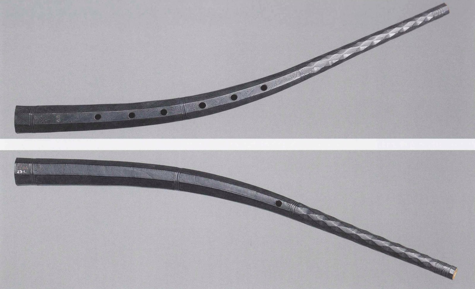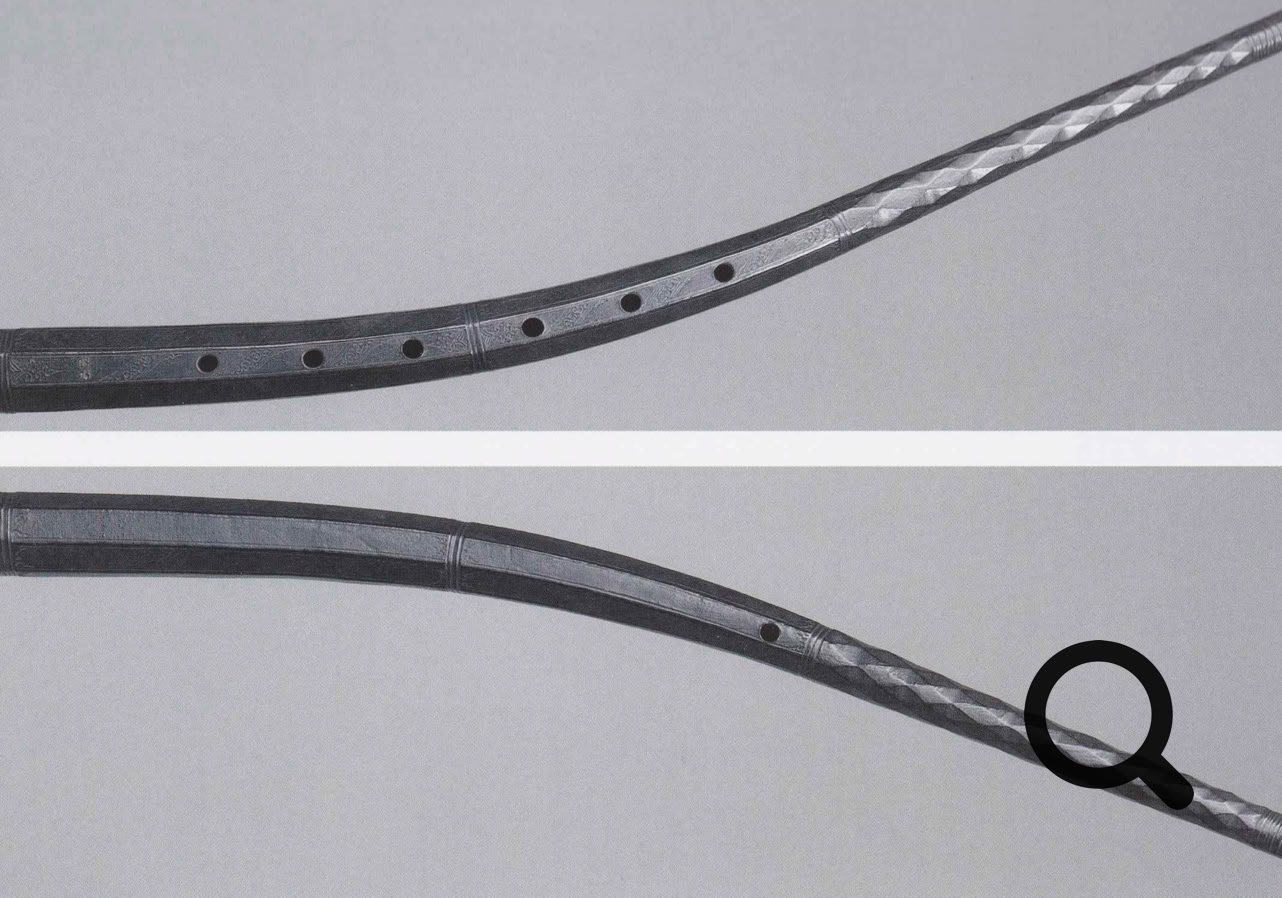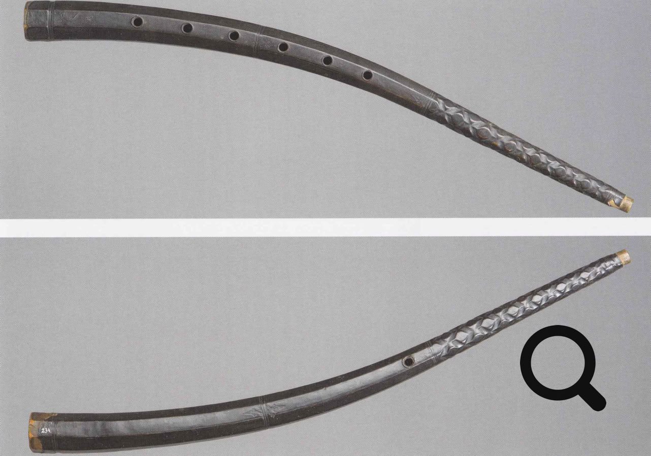 Right-curved soprano cornetto with a very curious shrinking at the lower end of its bore.